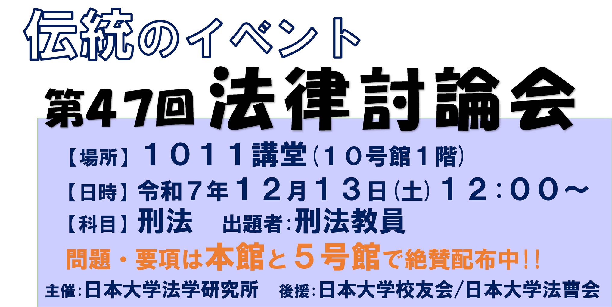 法律学科 第一部 法律学科 第二部 政治経済学科 新聞学科 経営法学科 公共政策学科 大学院法学研究科 大学院新聞学研究科 大学院法務研究科(ロースクール) NEWS 最新情報 ALL INFORMATION 学科トピックス 受験生の方へ 大学院からのお知らせ 図書館からのお知らせ 2026/1/16 INFORMATION 春季期間中の事務取扱時間等について 2026/1/9 経営法学科 佐藤正弘ゼミナールがビジネスアイデアコンテストで優秀賞を受賞しました 2025/12/23 INFORMATION 令和8年度入学許可者の入学前eラーニング学修について 2025/12/11 経営法学科 第 5 回経営法学科合同ゼミが開催されました。 2025/12/10 図書館学生協働 12月6日(土)第2回学生選書ツアーを開催しました! VIEW ALL 2026/1/16 INFORMATION 春季期間中の事務取扱時間等について 2025/12/23 INFORMATION 令和8年度入学許可者の入学前eラーニング学修について 2025/12/9 INFORMATION 令和7年度年末年始の事務取扱時間について 2025/11/27 INFORMATION 令和7年度定期無料法律相談会実施のお知らせ 2025/11/21 INFORMATION 雑誌「Pen+」(本学特集号)の発売について VIEW ALL 2026/1/9 経営法学科 佐藤正弘ゼミナールがビジネスアイデアコンテストで優秀賞を受賞しました 2025/12/11 経営法学科 第 5 回経営法学科合同ゼミが開催されました。 2025/11/21 法律学科 第一部 山田孝紀准教授がドイツのヨハネス・グーテンベルク大学(マインツ)で特別講義を行いました。 2025/11/12 総合・体育・外国語 外国語能力開発委員会主催「令和7年度外国語教授法講演会:Canvas LMS関係講演会」を開催しました。 2025/8/7 新聞学科 外国人教授特別セミナーを開催しました。 VIEW ALL 2025/11/21 入試関連 2026年度一般選抜を受験する方へ 2025/10/21 入試関連 2026年度入試における「高等教育の修学支援新制度」対象者への対応について 2025/10/9 入試関連 令和8年度入学者選抜における特別措置の振替受験申請書について 2025/10/6 入試関連 令和8年度入学者選抜における特別措置について 2025/10/3 入試関連 2026年度一般選抜募集要項を公開しました VIEW ALL 2026/1/22 法務研究科 令和7年度春季期間中の事務取扱等について 2026/1/9 法務研究科 令和8年度科目等履修生の募集について 2025/12/18 法務研究科 令和7年度年末年始の事務取扱等について 2025/12/15 法務研究科 令和8年度(2026年度)日本大学大学院法務研究科入学試験における成績開示について【Googleフォームの受付を終了いたしました】 2025/12/12 法務研究科 令和8年度日本大学大学院法務研究科入学試験(第3期)の合格発表について VIEW ALL 2025/12/10 図書館学生協働 12月6日(土)第2回学生選書ツアーを開催しました! 2025/11/30 図書館からのお知らせ 学修サポートコーナーの利用方法について 2025/11/12 図書館からのお知らせ 企画展「終戦から80年-戦時体制下の日本大学-」開催について 2025/10/31 図書館からのお知らせ 令和7年度 第2回学生選書ツアー開催のお知らせ 2025/10/3 図書館からのお知らせ 「サン=シモン・コレクション 没後200年展」開催について VIEW ALL PICKUP NEWS 第47回法律討論会が開催されました 令和7年度 資格・検定・公務員試験合格者褒賞授与式が行われました 日本大学法学研究会 第75回全日本学生法律討論会の結果について VIEW ALL コンセプトムービー 在学生からのメッセージムービー キャンパスツアー VIEW ALL 法律学科 YUKI SAGA 政治経済学科 MITSUSHIGE NAKAMURA 新聞学科 TAKAFUMI NIIMURA 経営法学科 YUMA IIMORI 公共政策学科 MIKA SAKAI