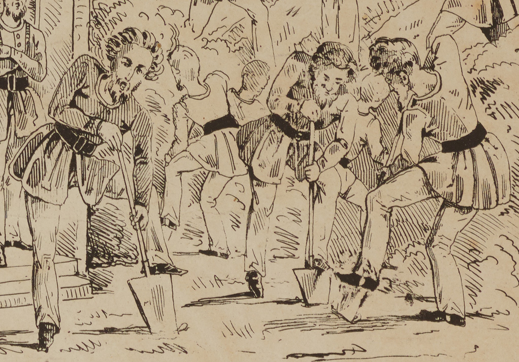 〔アンファンタンが歌い,鶴嘴,鋤(シャベル)を準備している従者2人〕
