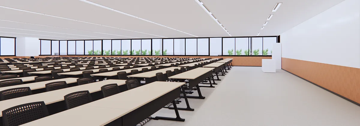 座席は,移動観覧席を設置し,ボタン1つで収納が可能となっています。階段状の講堂形式の他に,収納することでフラットなスペースとしての利用も可能で,あらゆる教育やイベントに対応できる空間として計画されています。ステージ正面には300型の大型LEDモニターも設置される予定です。