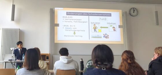 特別講義では、「日本の債権法改正」を紹介した後、「追完請求権の限界」や「民法における動物の位置づけ」「慰謝料」といった具体的なテーマを取り上げました。これらのテーマを通じて、日本とドイツの法律を比較して研究する意義を説明しました。 また、本授業には、本学法学部から1年間の留学で派遣されている学生2名も参加しました。