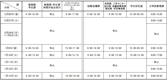 なお,図書館については,図書館ホームページの「図書館開館日程」を御確認ください。