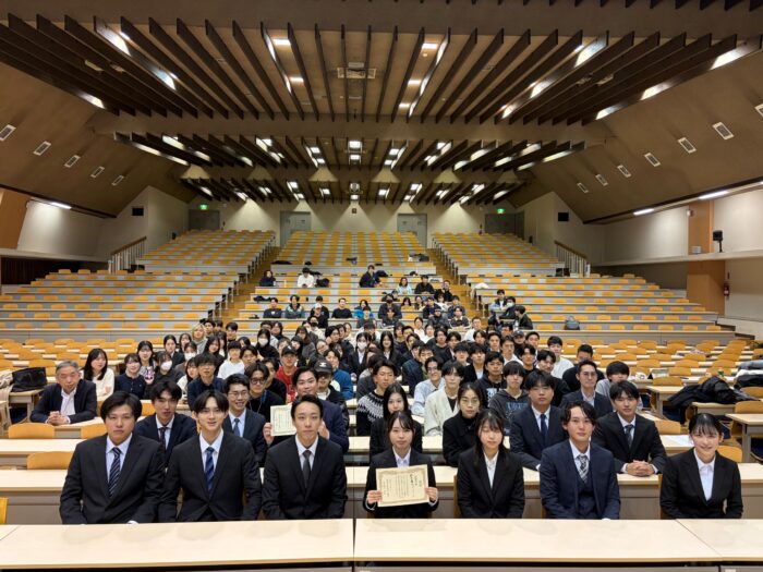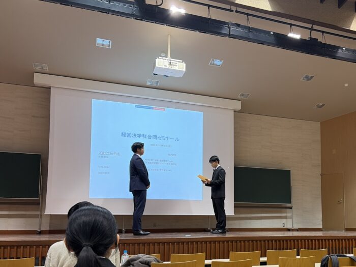 この合同ゼミは,学生主体で運営され,ゼミの研究成果を発表し活発な質疑応答が行われました。研究成果発表後に,審査員により経営系ゼミナールからは鈴木ゼミナール, 法学系ゼミナールからは劉ゼミナールにそれぞれ最優秀賞が授与されました。