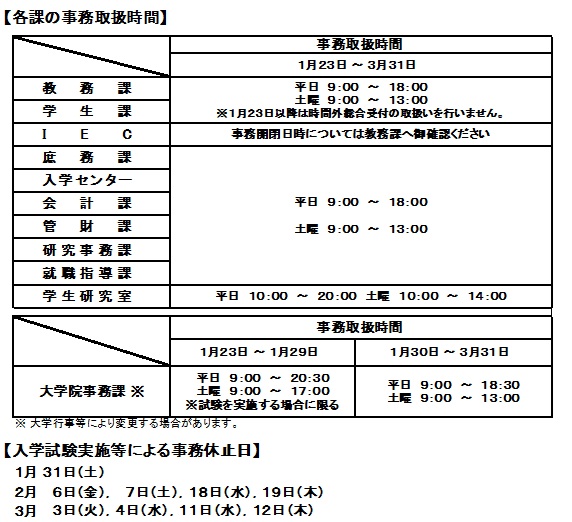 INFORMATION TOP NEWS INFORMATION 春季期間中の事務取扱時間等について 2026年1月16日 INFORMATION 春季期間中の事務取扱時間等について 前の記事 令和8年度入学許可者の入学前eラーニング学修について
