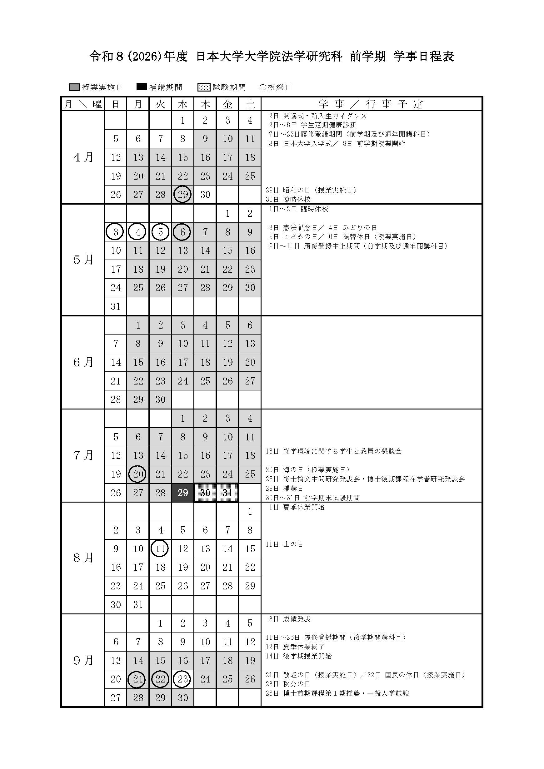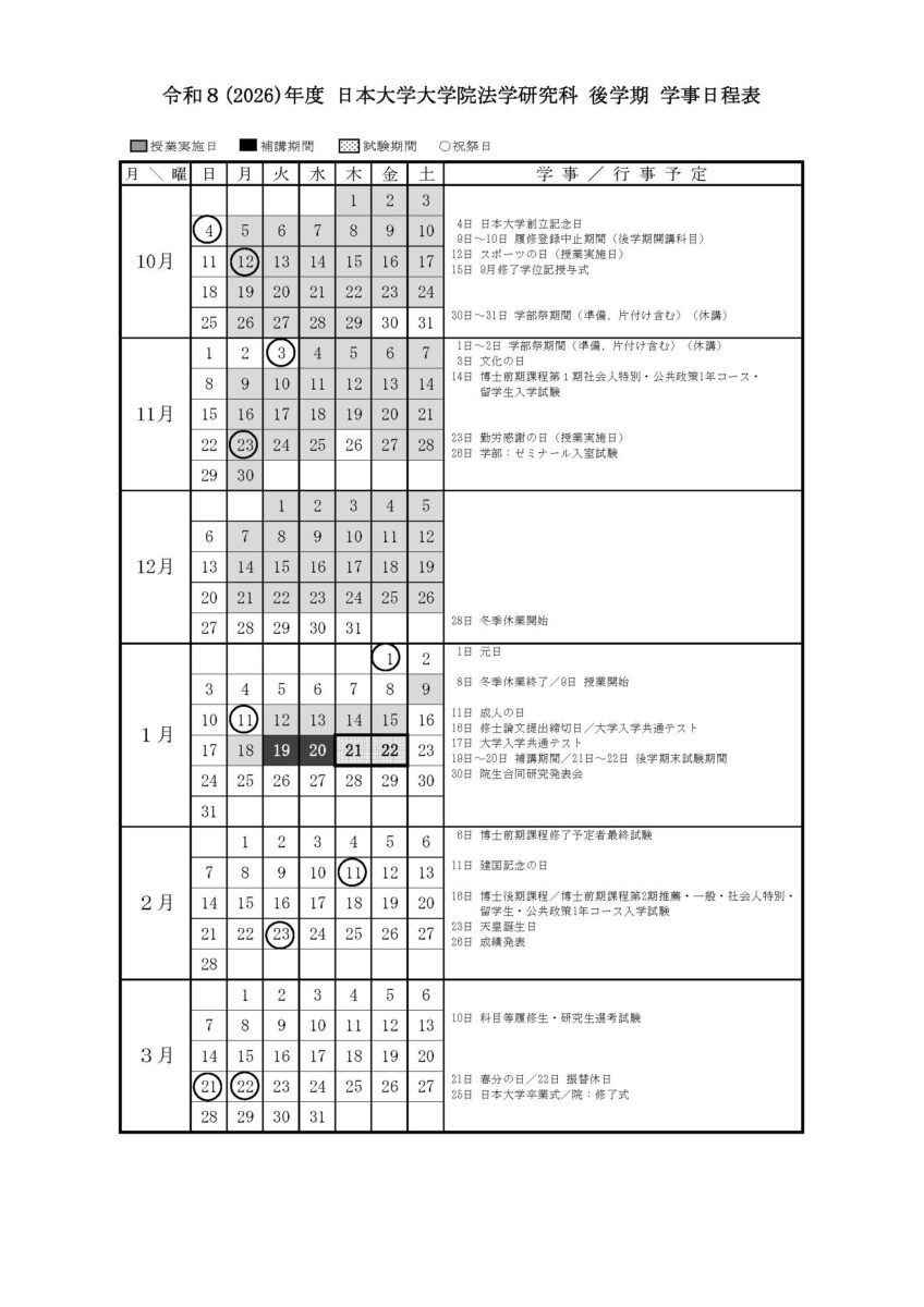 大学院からのお知らせ TOP NEWS 大学院からのお知らせ 法学研究科 令和8年度 学事日程表について 2026年3月19日 法学研究科 令和8年度 学事日程表について 標記の件について,令和8年度の学事日程表を掲載いたします。 令和8年度入学予定者の方については,ガイダンスや入学式等の詳細については改めてお知らせいたしますので,今しばらくお待ちください。 前の記事 令和7年度 年末年始の事務取扱について